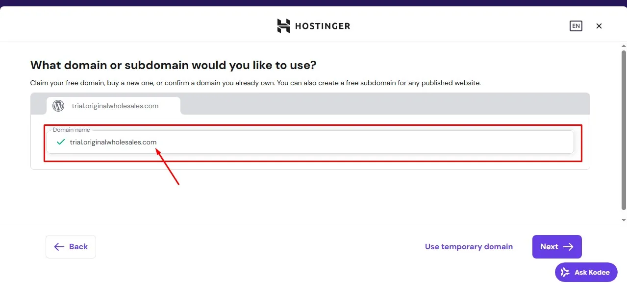 On this page select the domain you want to install the WordPress on, if you have multiple domains. But most times Hostinger will just put the domain you want especially if it’s the only available.